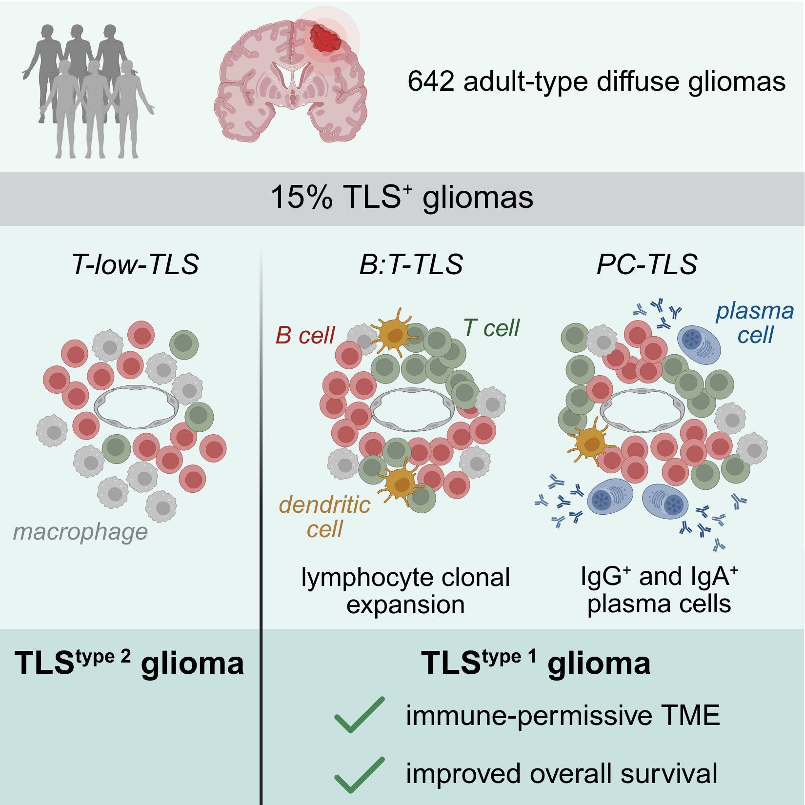 Gliomas respond poorly to therapy and are considered immunologically “cold” tumors. In this study we identify tertiary lymphoid structures (TLSs) in a subset of gliomas that show signs of functional adaptive immune activation such as clonal lymphocyte expansion and plasma cell formation. These functional TLSs are associated with longer overall patient survival and an immune-permissive tumor microenvironment. Such TLSs may represent a key determinant of glioma immune landscape, with clinical relevance. Cakmak et al. Immunity 2025.